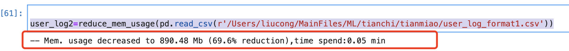 我這里有個dataframe文件叫做user_log,原始大小為1.91G,然后pandas讀取出來,內(nèi)存使用了2.9G。