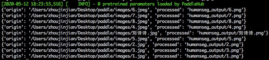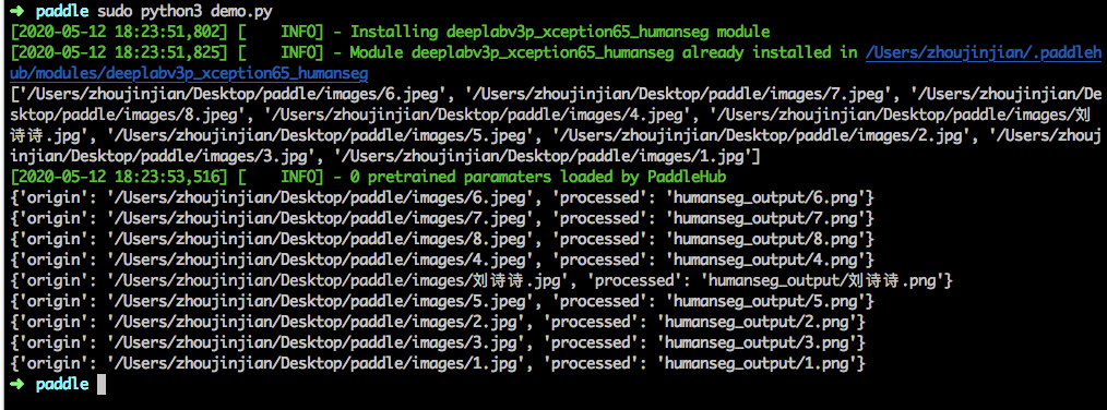 在運(yùn)行示例代碼時(shí),如果沒有單獨(dú)安裝模型deeplabv3p_xception65_humanseg,默認(rèn)會自動在執(zhí)行前進(jìn)行安裝。但安裝完成后,執(zhí)行結(jié)果并沒有生成扣圖結(jié)果及humanseg_output目錄,輸出結(jié)果類似如下所示: