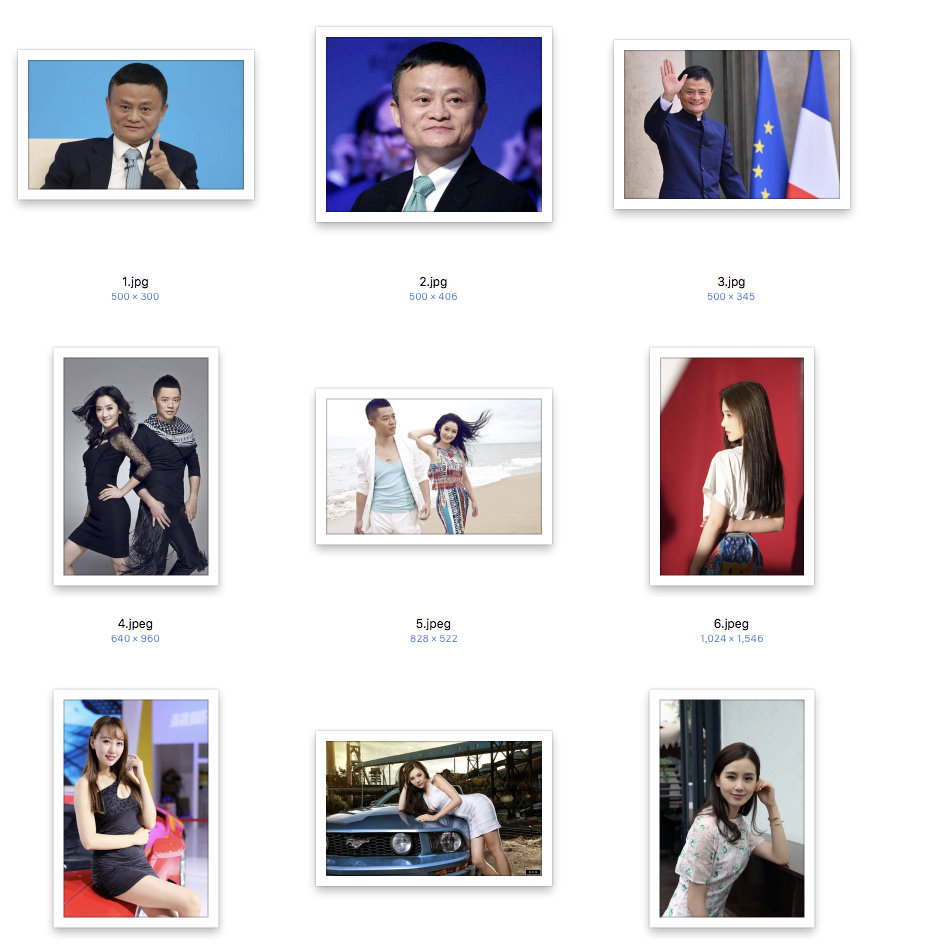 其中示例 images 目錄下放了9張圖片,為了兼顧不同讀者喜好的口味,示例圖片中既包括了帥哥,也有美女哦,并且將他們縮略圖放大了,如下: