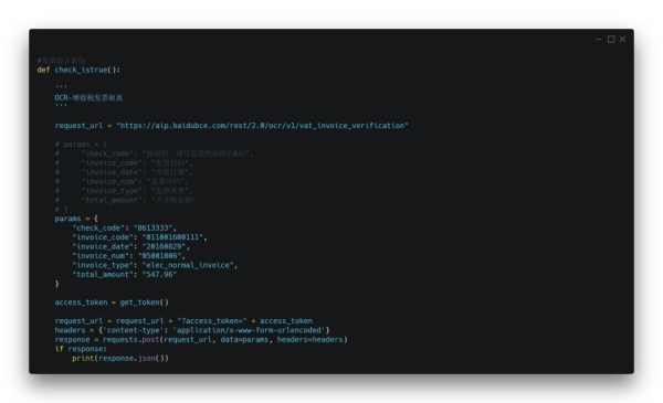 所有在上面的開始識(shí)別之前(自己公司的發(fā)票可能不需要查驗(yàn)這步),先調(diào)用一下第三方的接口,對(duì)發(fā)票進(jìn)行識(shí)別,識(shí)別通過(guò)之后再將其提取發(fā)票中目標(biāo)內(nèi)容。