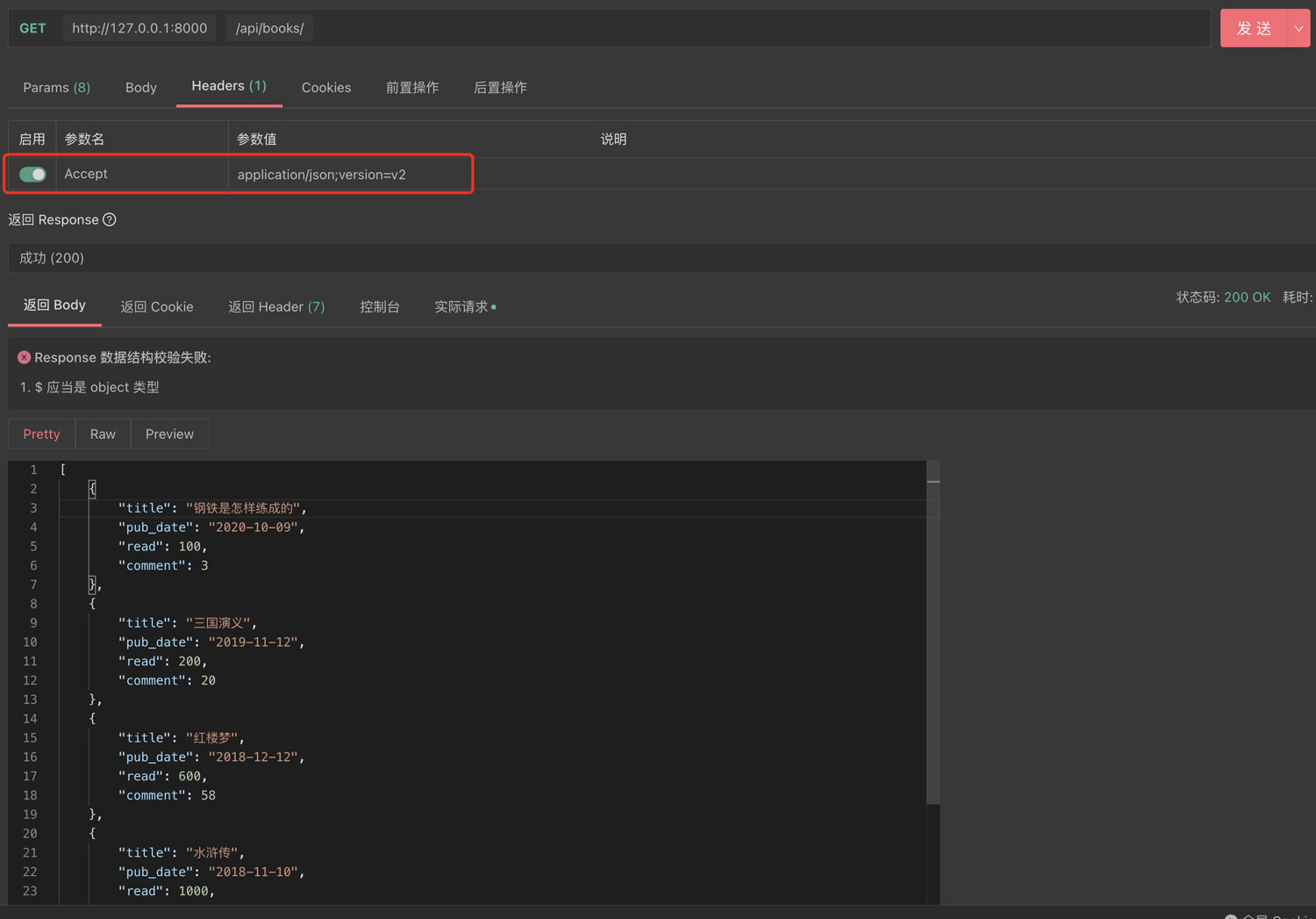 我們?cè)谡?qǐng)求頭中添加字段Accept:application/json;version=v2,就會(huì)返回BookSerializerV2的序列化字段,也就是沒(méi)有image字段
