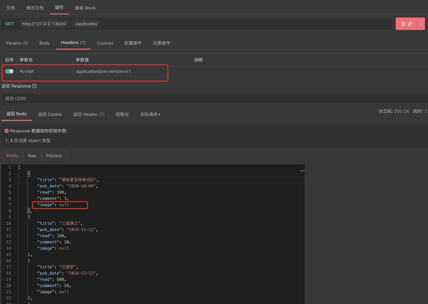 我們?cè)谡?qǐng)求頭中添加字段Accept:application/json;version=v1,就會(huì)返回BookSerializer的序列化字段,也就是有image字段