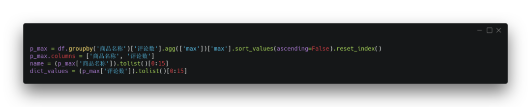 從數(shù)據(jù)中取出:商品名稱(chēng)和評(píng)論數(shù)這兩列,這里根據(jù)評(píng)論數(shù)去作為銷(xiāo)售依據(jù),對(duì)商品的銷(xiāo)量進(jìn)行排序(高到低),并取出前15名進(jìn)行可視化。