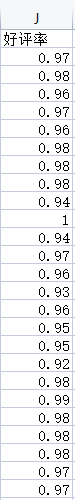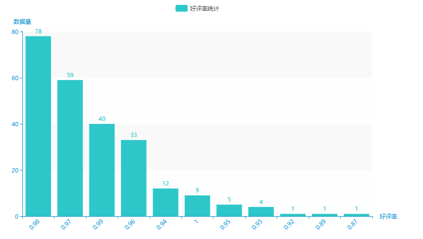 從數(shù)據(jù)中取出:好評(píng)率這列,對(duì)不同的好評(píng)率進(jìn)行統(tǒng)計(jì),如好評(píng)率是100%(1)的商品多少件,好評(píng)率99%(0.99)的商品多少件等。