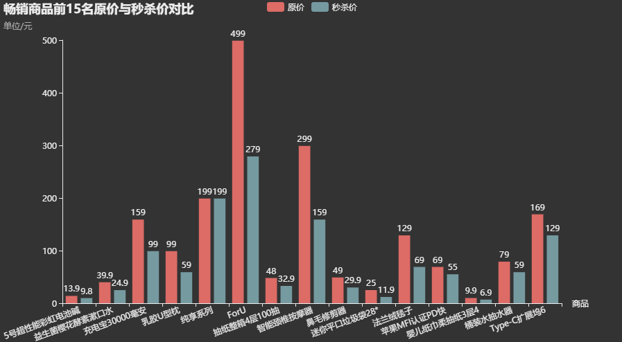 4.可視化-暢銷(xiāo)商品前15名原價(jià)與秒殺價(jià)對(duì)比