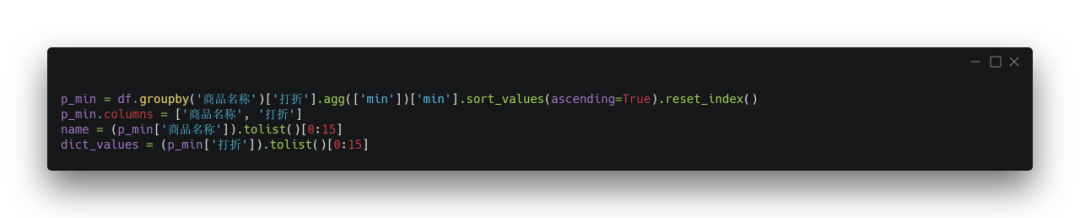 從清洗后數(shù)據(jù)中取出:商品名稱(chēng)和打折這兩列,進(jìn)行【排序】從打折最大到打折最小。最后取出前15名進(jìn)行可視化