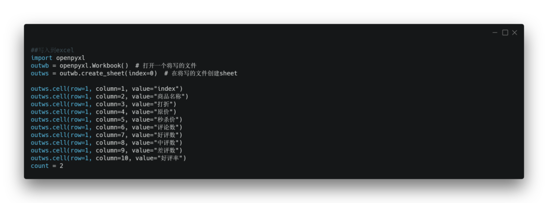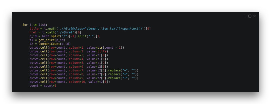 其中的get_price和CommentCount是步驟4和步驟5的函數(shù)。count是excel中行數(shù),因此在循環(huán)中count+1,依次寫(xiě)入下一行。