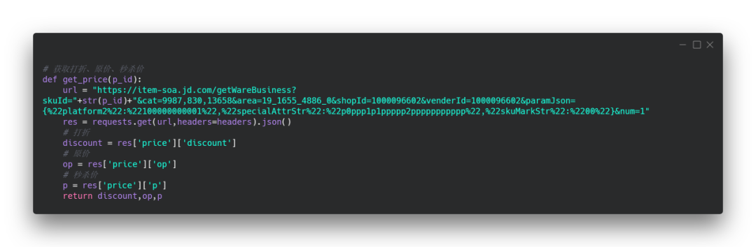 通過(guò)商品ID可以獲取到商品打折、原價(jià)、秒殺價(jià)(這里有接口,接口是通過(guò)抓包獲取的,感興趣的可以去自己去嘗試,不明白的可以直接使用)