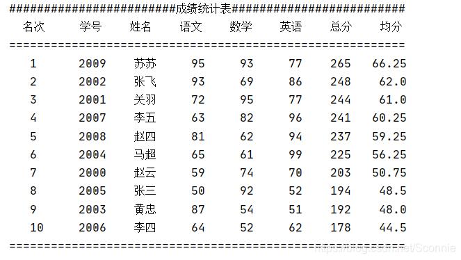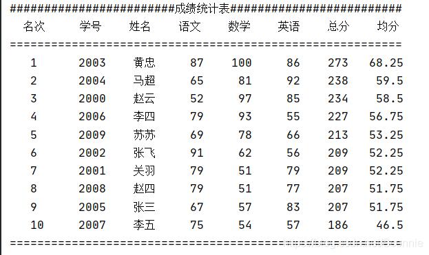 list_index=["名次","學(xué)號","姓名","語文","數(shù)學(xué)","英語","總分","均分"] #定義字段名