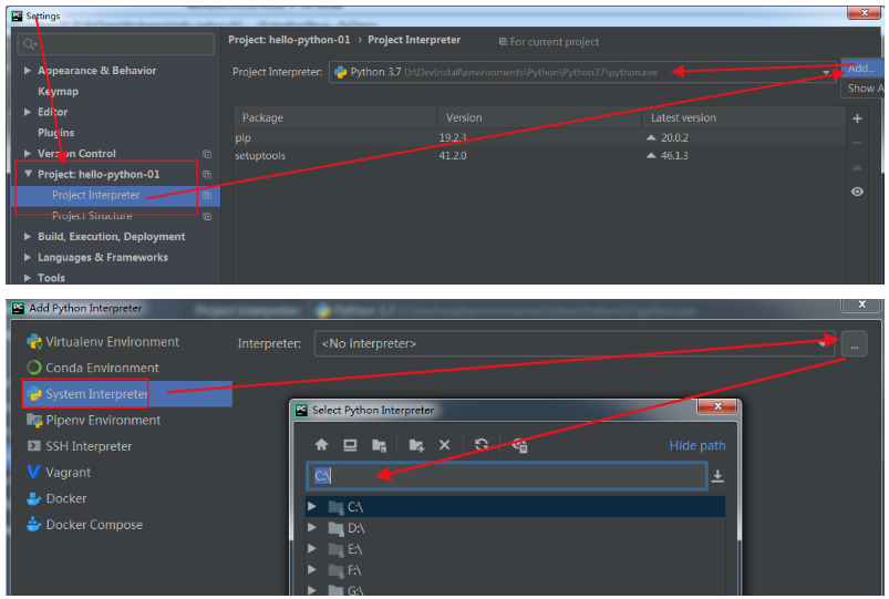 [File] —> [Settings...] —> [Project: 項目名稱] —> [Project Interpreter] —> [設(shè)置圖標] —> [Add] —> 選擇你需要的Python解釋器位置 —> [OK]。