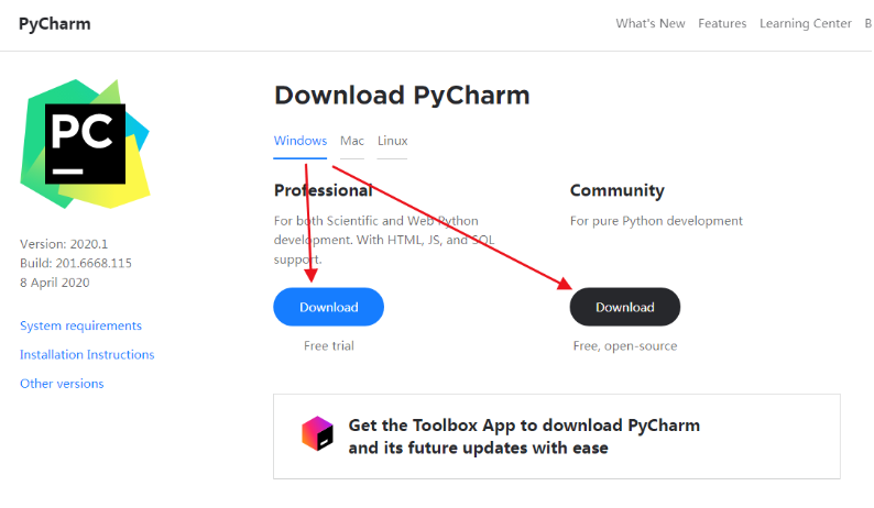 先登陸Pycharm官網(wǎng)或者直接輸入Pycharm下載地址:https://www.jetbrains.com/pycharm/download/。