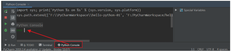 在PyCharm中也集成了Python的交互界面。用法同命令行交互界面一樣,也不能保存數(shù)據(jù),只能進行簡單測試。