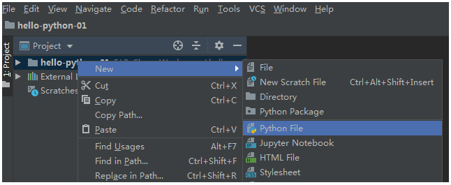 項目根目錄或根目錄內(nèi)部任意位置 —> 右鍵 —> [New] —> [Python File] —> 輸入文件名 —> [OK]