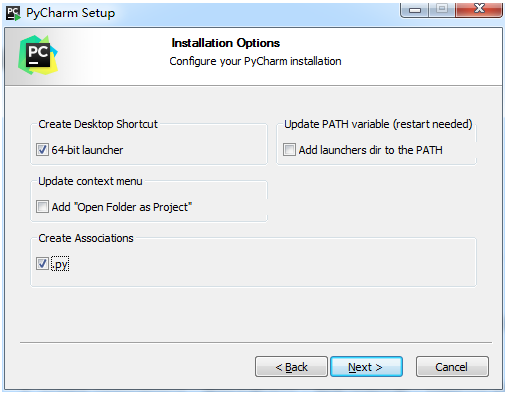 Create Associations:是否關(guān)聯(lián)文件,如果勾選關(guān)聯(lián),以后打開.py文件就會用PyCharm打開,請根據(jù)需要勾選。。