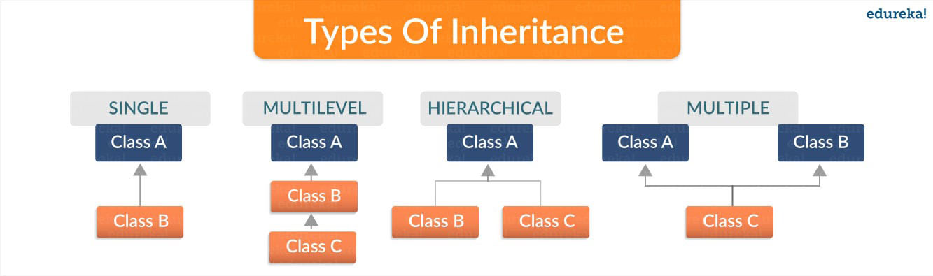 繼承是指創(chuàng)建包含其父類的專業(yè)化的子類的能力。它進一步分為四種類型,即單繼承、多級繼承、分層繼承和多重繼承。請參考下圖以獲得更好的理解。