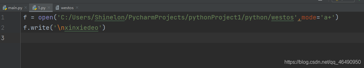 f = open('C:/Users/Shinelon/PycharmProjects/pythonProject1/python/westos',mode='a+')