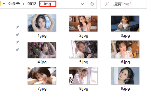 這里在網(wǎng)上找了9張圖片,并存放在img文件夾下,這9張圖片一會(huì)待轉(zhuǎn)換為GIF動(dòng)圖。