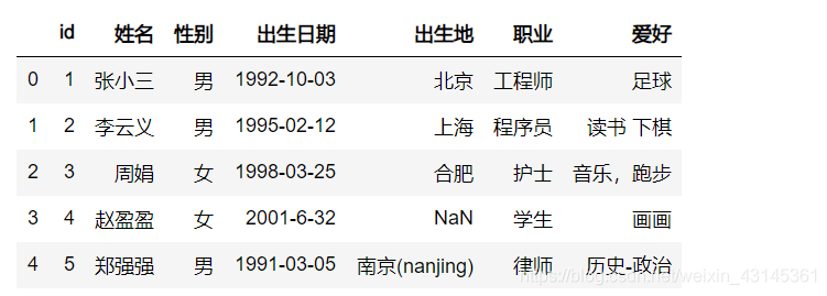 id,姓名,性別,出生日期,出生地,職業(yè),愛好