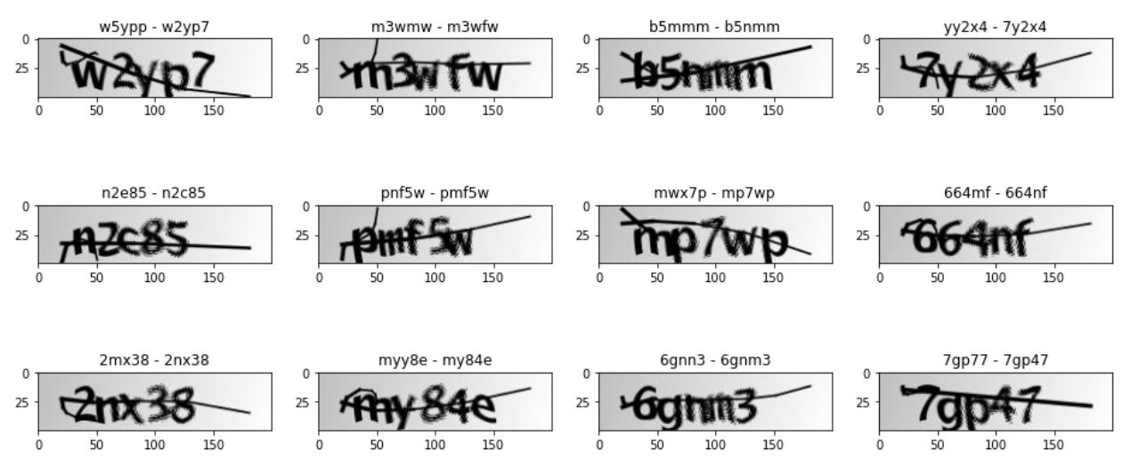 圖片是5個(gè)字母的單詞,可以包含數(shù)字。這些圖像應(yīng)用了噪聲(模糊和一條線)。它們是200 x 50 PNG。我們的任務(wù)是嘗試制作光學(xué)字符識(shí)別算法的模型。