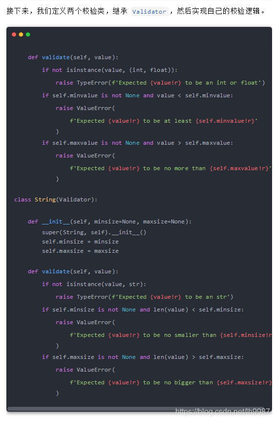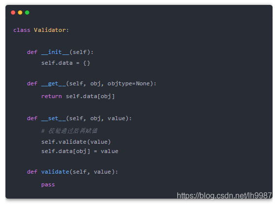 首先我們定義一個校驗基類 Validator,在 __set__ 方法中先調用 validate 方法校驗屬性是否符合要求,然后再對屬性進行賦值。