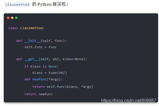 看到了嗎?A 的 foo 方法其實實現(xiàn)了 __get__,我們在上面的分析已經得知:只定義 __get__ 方法的對象,它其實是一個非數(shù)據(jù)描述符,也就是說,我們在類中定義的方法,其實本身就是一個非數(shù)據(jù)描述符。