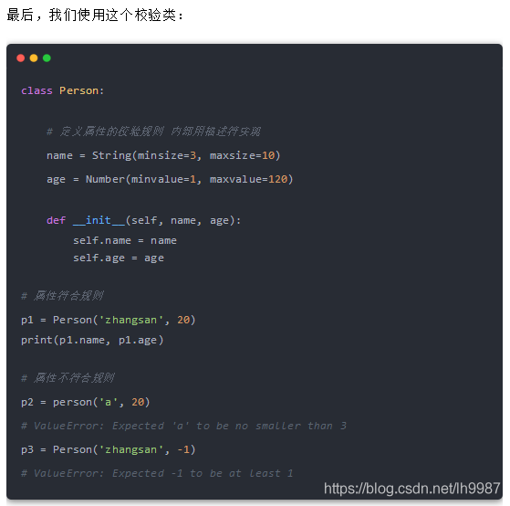 在這里我用描述符實現(xiàn)了一個屬性校驗器,你可以參考這個例子,在類似的場景中去使用它。
