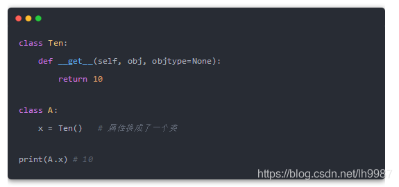 仔細看,這次類屬性 x 不再是一個具體的值,而是一個類 Ten。Ten 中定義了一個 __get__ 方法,返回具體的值。