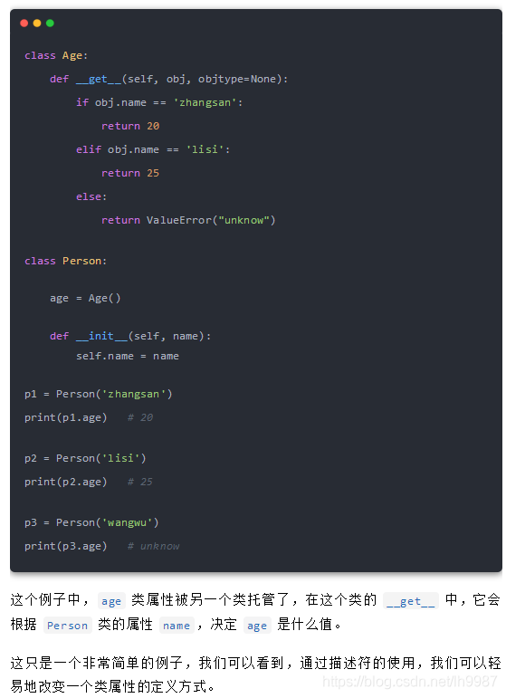 在這例子中,類屬性 age 是一個描述符,它的值取決于 Age 類。