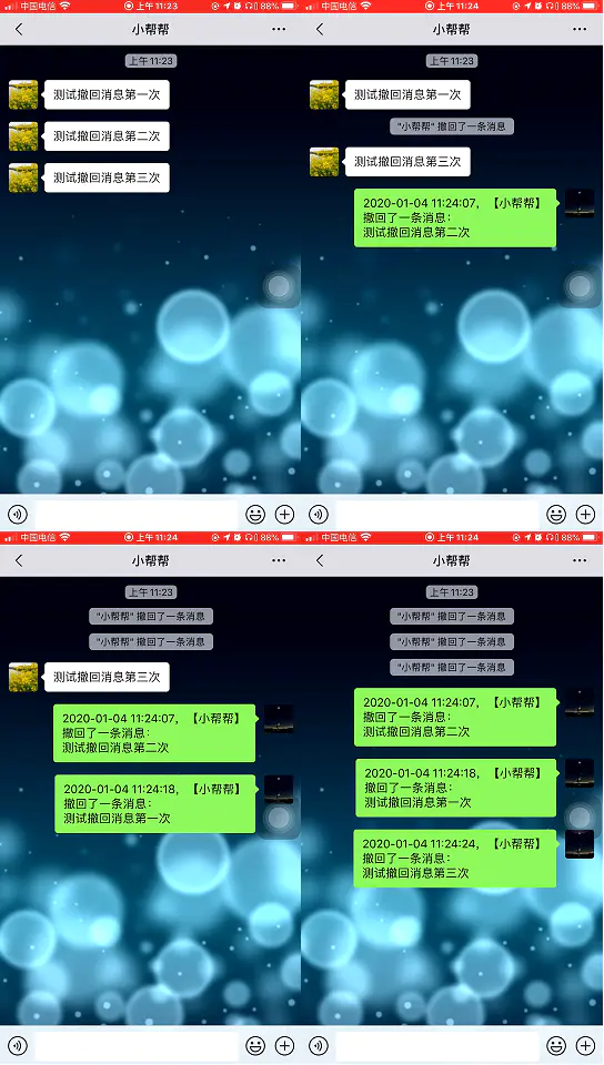 大概是這樣:短時(shí)間內(nèi)同一位好友發(fā)送了多條消息,當(dāng)他隨便撤回一條消息時(shí),我們不能確定他到底撤回的到底是哪一條消息。只能猜他可能是撤回了最近的一條消息,然后將其他消息貼出來(lái)作為備選。代碼如下: