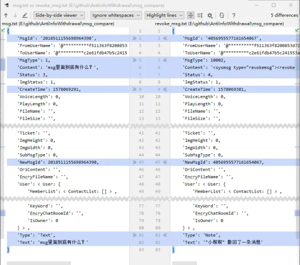 要想確定撤回了哪一條信息,就必須先熟悉普通msg和撤回的msg里面都有哪些信息,他們的相同點(diǎn)和不同點(diǎn)。下面就來(lái)看看這兩種情況下msg都是怎么樣的,不需要仔細(xì)的看每一行,后面會(huì)作具體分析。