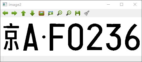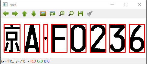 對(duì)于二值化后的灰度圖,在確定了各個(gè)字符坐標(biāo)后,使用cv2.rectangle()方法畫矩形框:cv2.rectangle(image2, (Position[m][0],Position[m][1]), (Position[m][2],Position[m][3]), (0, 255, 0), 2)。其中,第一個(gè)參數(shù)表示原圖,第二個(gè)參數(shù)表示矩陣的左上點(diǎn)坐標(biāo),第三個(gè)參數(shù)表示矩陣的右下點(diǎn)坐標(biāo);第四個(gè)參數(shù)是畫線對(duì)應(yīng)的RGB顏色,第五個(gè)參數(shù)是畫線寬度。在設(shè)置RGB顏色時(shí)發(fā)現(xiàn)矩形框顏色只能顯示為黑色和白色,原因是在二值圖上畫圖顏色沒有三通道,無法顯示彩色圖像。