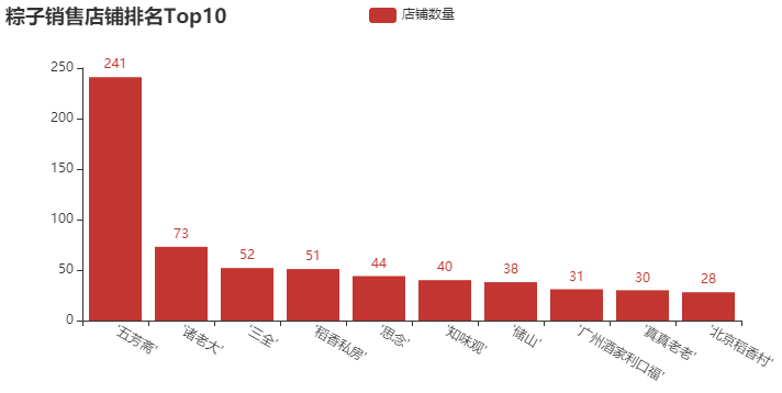 結(jié)論分析:在我印象中,小時候一直吃的最多的就是 “甜粽子”,直到我上了初中才知道,粽子還可以有肉?當然,從圖中可以看出,賣 “鮮肉粽” 的店鋪還是居多,畢竟這個送人,還是顯得高端、大氣一些。這里還有一些口味,像 “蜜棗粽”、“豆沙粽”,我基本沒吃過。如果你送人,你會送什么口味的呢?