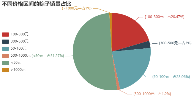 結(jié)論分析:這里,我故意把價格區(qū)間細分。這個餅圖也很符合實際,畢竟每年就過一次端午節(jié),還是以薄利多銷為主,接近80%的粽子,售價都在100元以下。當然,還有一些中檔的粽子,價格在100-300元。大于300元,我覺得也沒有吃的必要,反正我是不會花這么多錢去買粽子。