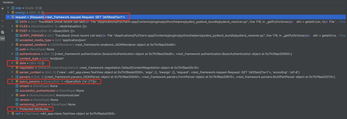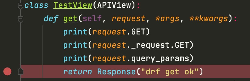 我們創(chuàng)建了TestView視圖,視圖函數(shù)中打印了3個request屬性,并且在response上打了一個斷點,接下來通過url訪問視圖,進(jìn)入斷點如下,