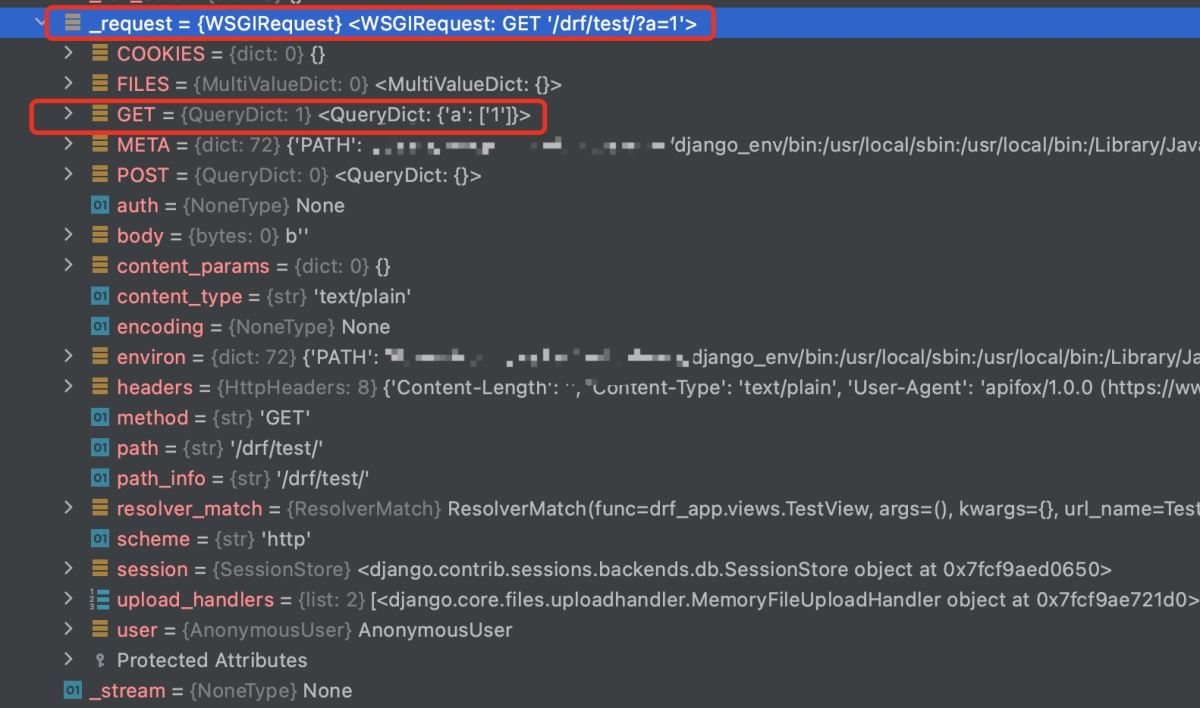 我們可以看到_request是WSGIHttpRequest對象,所以它會有GET屬性,所以我們視圖中打印的request.GET實際上和request._request.GET是一樣的,因為request沒有GET屬性,所以它就會訪問_request中的GET屬性,最后我們查看打印結(jié)果,如下: