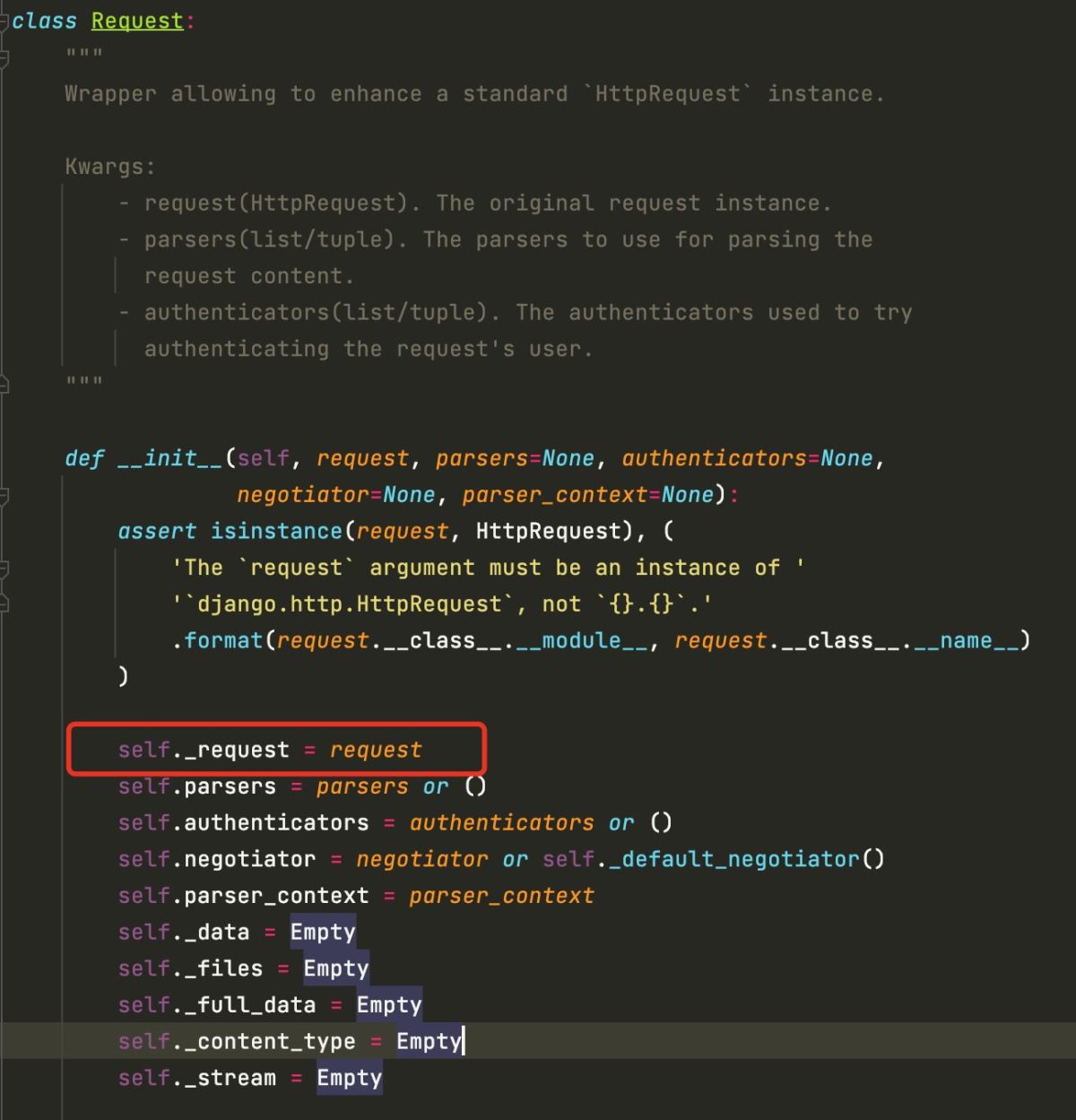 我們可以分析出,內(nèi)部對request做了二次封裝,_request是一個HttpRequest對象,并且Request類中還有__getattr__此方法,代碼如下: