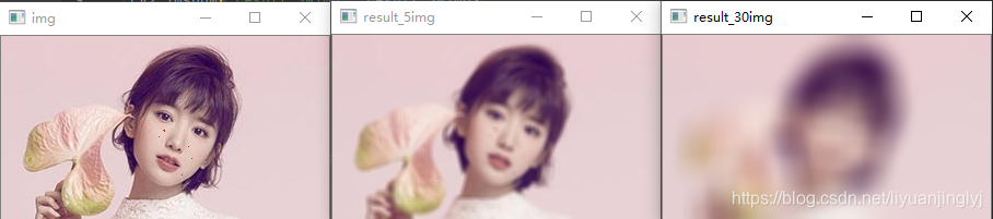 從上圖可以看出來,使用(5,5)卷積進(jìn)行均值濾波處理后圖像雖然模糊,但還可以辨認(rèn)。而使用(30,30)卷積進(jìn)行均值濾波,圖像失真非常嚴(yán)重。