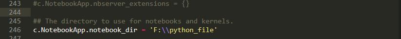 2.找到 #c.NotebookApp.notebook_dir = ‘',去掉該行前面的“#”;在打算存放文件的位置先新建一個(gè)文件夾(很重要,最好是英文的),然后將新的路徑設(shè)置在單引號(hào)中,保存配置文件。