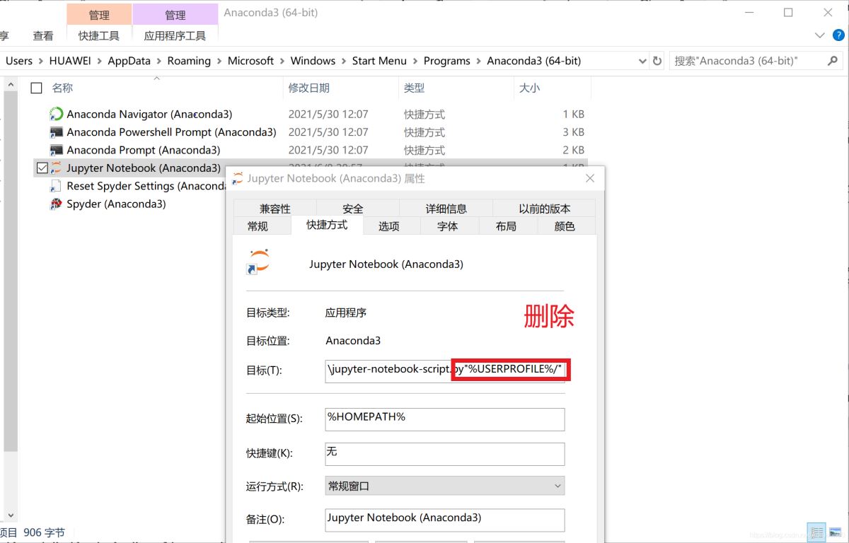 -找到對(duì)應(yīng)的“Jupyte Notebook”快捷圖標(biāo),鼠標(biāo)右擊 -- 屬性 -- 目標(biāo),去掉后面的 "%USERPROFILE%/"(很重要),然后點(diǎn)擊“應(yīng)用”,“確定”