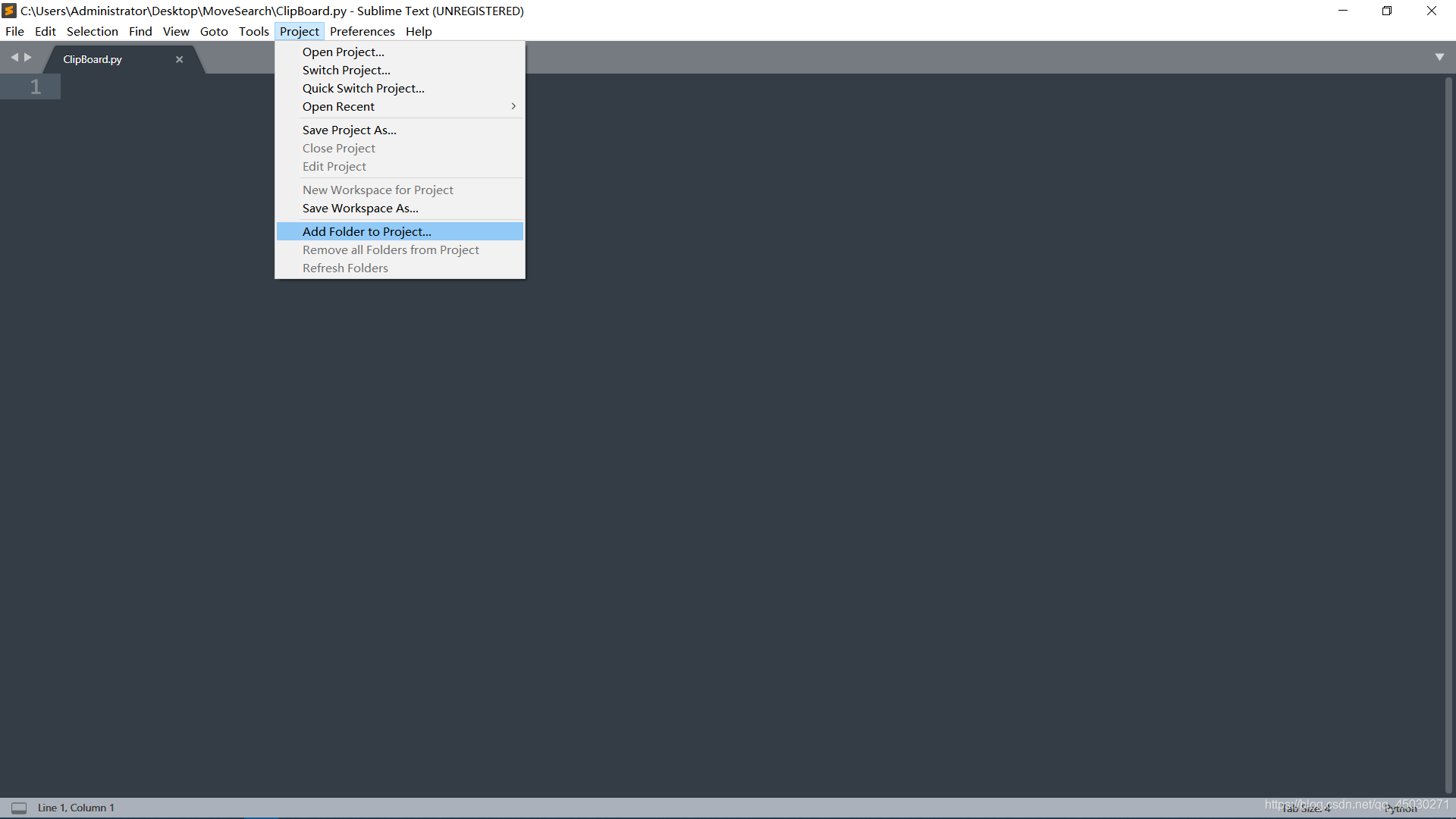 我們這里使用Sublime進行操作演示,我們點開“ClipBoard.py”的文件,然后我們按照下面的圖片添加文件夾到工作路徑