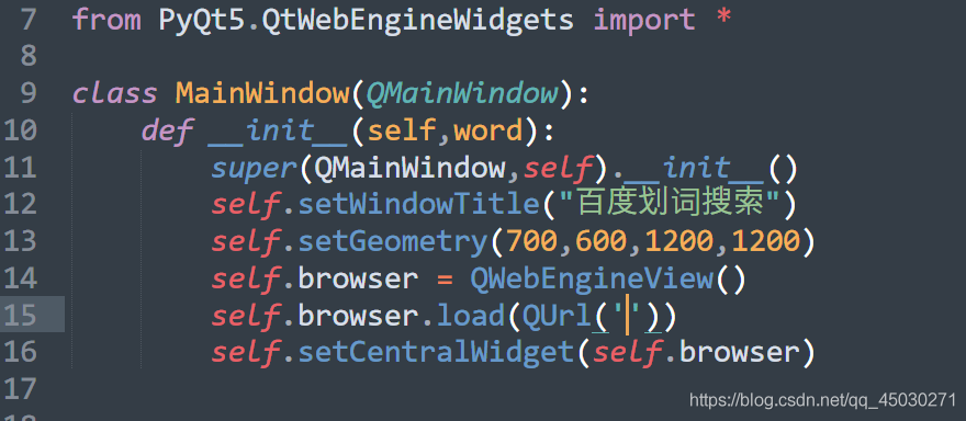 首先我們先設(shè)置窗口的標題,接下來設(shè)置窗口出現(xiàn)的位置和它的大小,接下來使用瀏覽器文件創(chuàng)建它。在這里我們并沒有寫出訪問的鏈接,因為我們還不知道百度的搜索規(guī)則