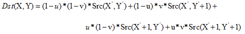 2、雙線性:由相鄰的四像素(2*2)計(jì)算得出,公式,