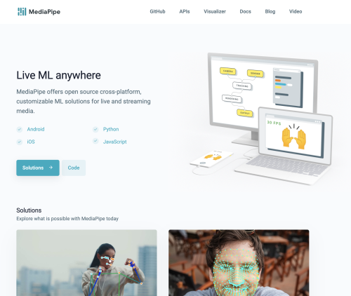 谷歌出了一個開源的、跨平臺的、可定制化的機(jī)器學(xué)習(xí)解決方案工具包,給在線流媒體(當(dāng)然也可以用于普通的視頻、圖像等)提供了機(jī)器學(xué)習(xí)解決方案。感興趣的同學(xué)可以打開這個網(wǎng)址了解詳情:mediapipe.dev/
