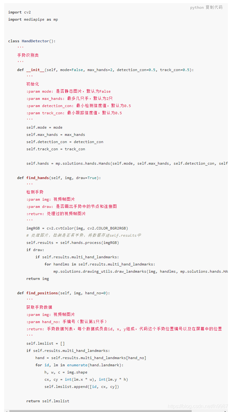 編寫一個handutil.py模塊,這個handutil模塊有一個HandDetector類,提供了檢測手勢、獲取手勢數(shù)據(jù)的方法。代碼如下,詳細(xì)解釋看代碼注釋: