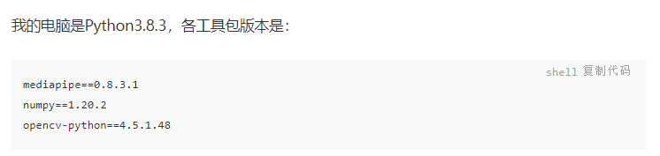 電腦需要安裝Python3,建議安裝Python3.8.x的版本。除此之外,還需要安裝Opencv-Python、MediaPipe以及numpy幾個工具包,可以使用pip進(jìn)行安裝: