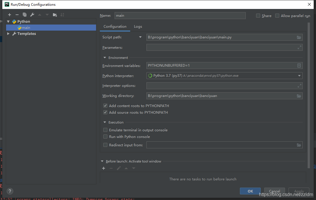 然后進(jìn)行如下設(shè)置,設(shè)置后之后就能通過運(yùn)行main.py運(yùn)行scrapy項(xiàng)目了