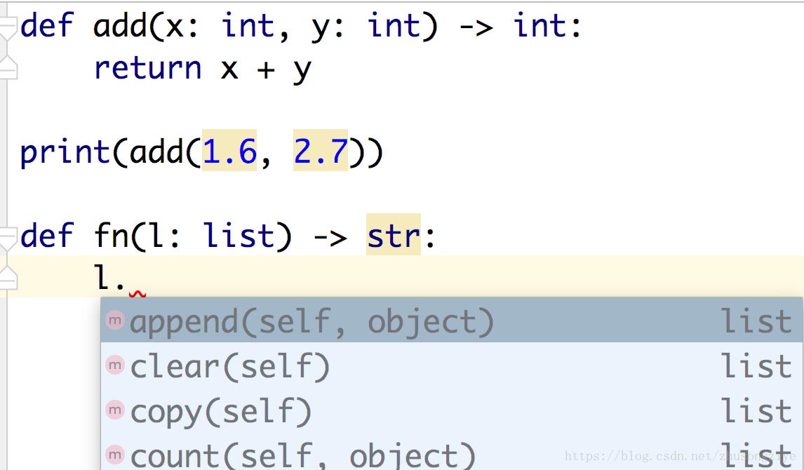 讓 IDE 了解類型,從而提供更準(zhǔn)確的代碼提示、補(bǔ)全和語法檢查(包括類型檢查,可以看到 str 和 float 類型的參數(shù)被高亮提示)