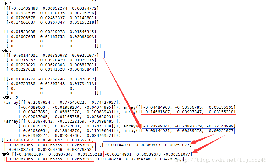 同樣正向用紅色,反向用藍色。改函數返回的輸出值,沒有將正反向拼接。輸出的狀態(tài)雖然是一個值,但是里面有兩個元素,一個代表正向狀態(tài),一個代表反向狀態(tài).