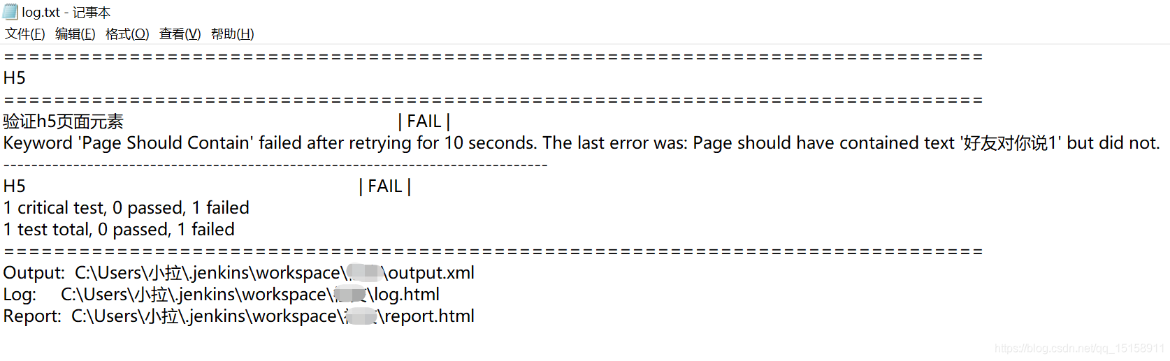 3.本次使用的是robot框架,測試用例運行完成后控制臺輸出的日志導(dǎo)出到log.txt文件如下