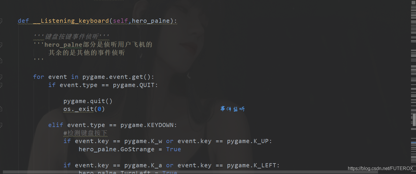 具體思路是用pygame.event.get()進(jìn)行事件檢測(cè)。之后檢測(cè)到按下某一個(gè)按鍵,例如向前移動(dòng)是,就會(huì)設(shè)置向前移動(dòng)的信號(hào),那么這個(gè)時(shí)候飛機(jī)就會(huì)一直往前走。當(dāng)松開后,那么設(shè)置信號(hào)為假,那么飛機(jī)就會(huì)停下來。由于飛機(jī)會(huì)一直在循環(huán)里面檢測(cè)有沒有按下那個(gè)向前,所以當(dāng)你長(zhǎng)按往前時(shí),飛機(jī)會(huì)一直往前,直到你松開。